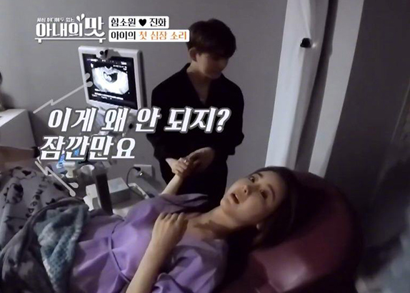 陳華在B超室外面等待著妻子,這時候咸素媛叫他進(jìn)去看還沒有成型的寶寶。剛開始因為彩超機(jī)器故障,以至于沒有顯示寶寶的心跳,咸素媛和陳華都非常的擔(dān)心,好在醫(yī)生調(diào)節(jié)好機(jī)器,咸素媛聽到寶寶心跳之后懸著的心終于落地